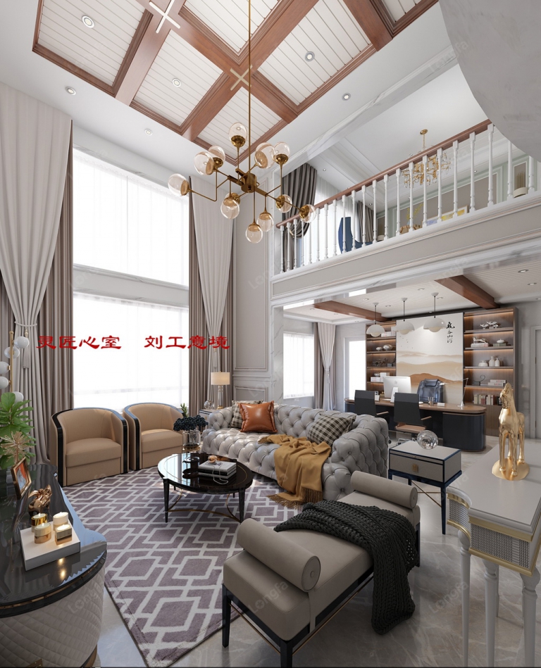 办公区与客厅相连,实际上是一个大厅,所以在客厅效果的基础上,加入了深色调,使之与客厅即统一又有所区分和呼应,深棕色和黑色的加入,使办公区在温和柔美、华美大气的基础上更显成熟内敛、沉稳大气、庄重典雅。视觉上更加的完美。