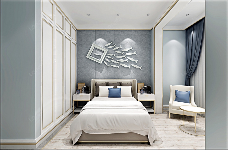 褐色的硬包作背景墙面,蓝色的条形地毯,床品是灰色,白色点缀,十分的温柔,床两边的壁灯,非常诱人,整个空间的色彩搭配,体现着柔美雅致的格调。