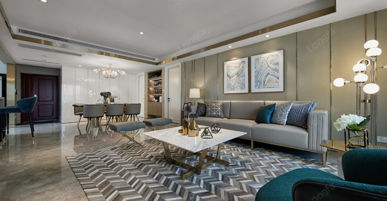 沙发背景墙上采用金属线条与定制造型相结合,让整个空间更加丰富。