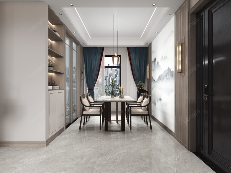 餐厅的设计手法和客厅是相互连贯式的,形成了统一的调性和功能,餐厅左边墙体全部拆除后两边各做酒柜和冰箱的收纳空间,中间以玻璃推拉门连贯,既能增加收纳空间,又能增加空间的延展性。右侧的墙体在极大的程度上体现了中式的对称美学,同时注入了现代的金属元素,将一幅山水延绵的水墨丹青藏那其中,简约素雅的装饰让空间随之静谧,身心享受安静。