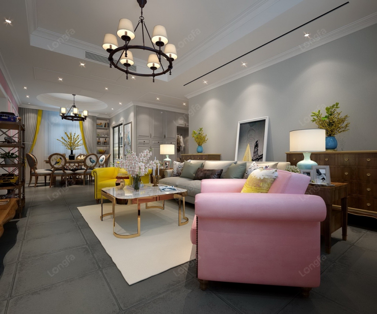 原有结构客厅和餐厅分区明确,大面积的灰色哑光地砖增加的空间的质感,灰色墙面点缀脏粉色电视餐厅背景墙,增加的空间的活泼性,沙发后面的装饰柜和电视墙的展示柜相互呼应,增加了空间的层次感,整体大方,自然。
