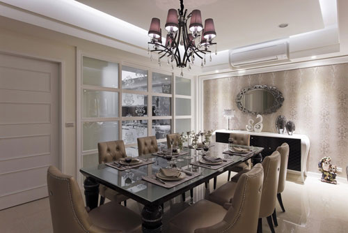 小编点评:从端景墙延伸的壁纸语汇向内串联客餐厅,巧妙利用茶镜与线板的切割形塑井然的大宅层次。
